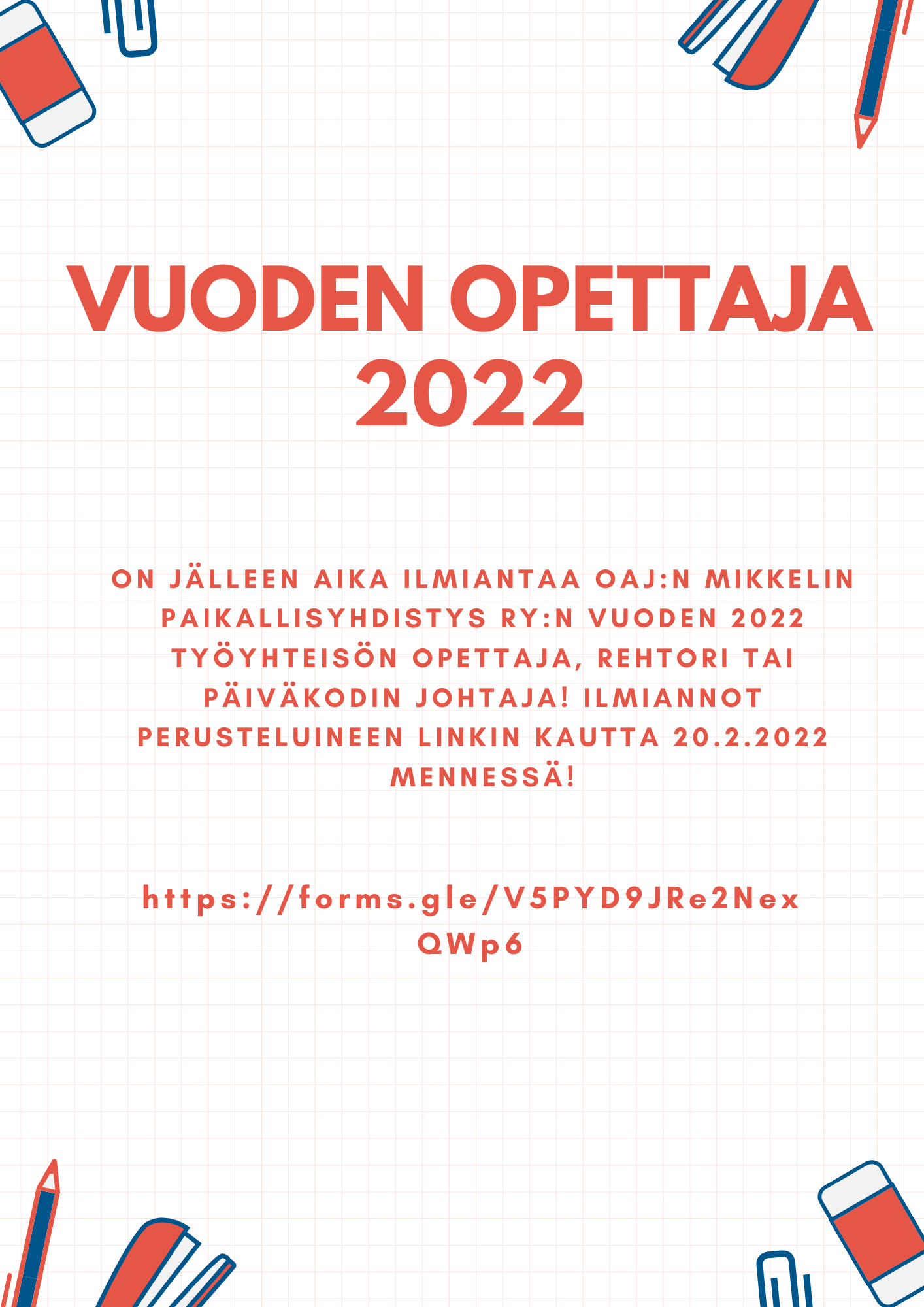 Työskenteleekö sinun työyhteisössäsi huikea opettaja, rehtori tai päiväkodin johtaja? Nyt on aika ilmiantaa hänet lyhyiden perusteluiden kera! OAJ Mikkeli palkitsee jälleen jäsenistään Vuoden opettajan vuodelle 2022! Voit käydä antamassa oman ehdotuksesi 20.2.2022 saakka osoitteessa https://forms.gle/V5PYD9JRe2NexQWp6! OAJ Mikkelin Vuoden opettaja 2022 palkitaan yhdistyksen kevätkokouksessa.