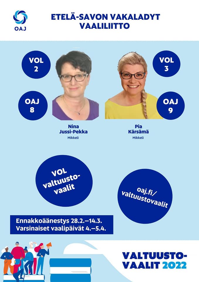 Joko olet äänestänyt? Vielä 14.3 asti ehtii äänestää OAJ:n ja VOL:n valtuustovaaleissa verkossa! Varsinaiset äänestyspäivät ovat sitten 4.-5.4. Tällä hetkellä äänestysprosentit on vain 10% molemmin puolin, eli monen kannattaa pikimmiten suunnata OAJ:n jäsensivuille!