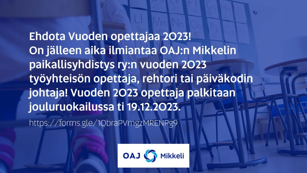 Löytyykö Vuoden opettaja tänä vuonna teidän työyhteisöstänne? Käy ilmiantamassa huikea opettaja, rehtori tai päiväkodin johtaja oheisen linkin kautta https://forms.gle/1QbraPVmgzMRENPg9 . Vuoden opettaja palkitaan jouluruokailussa 19.12.2023!