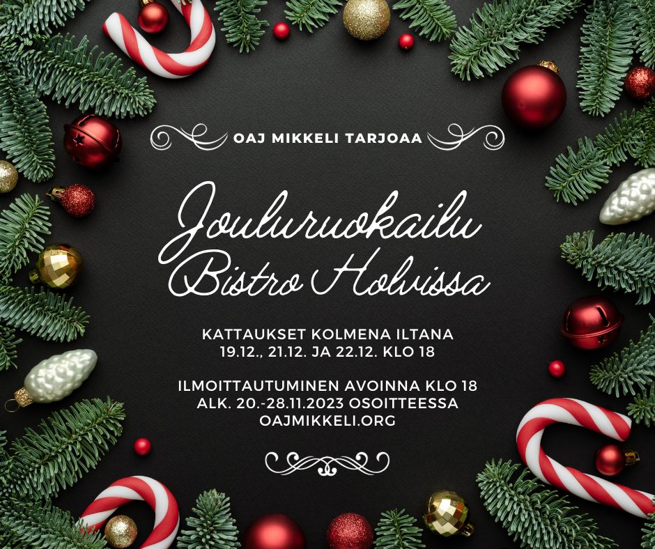 OAJ:n Mikkelin paikallisyhdistys ry järjestää jäsenilleen jouluruokailun bistro Holvissa. Jotta mahdollisimman monella olisi mahdollisuus osallistua, järjestetään kolme kattausta ti 19.12., to 21.12. ja pe 22.12. Ilmoittautuminen aukeaa maanantaina 20.11. klo 18 tässä postauksessa ja on avoinna 28.11. asti.