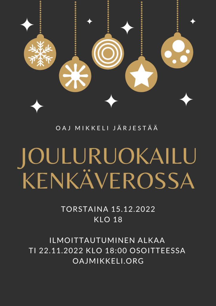 OAJ Mikkeli järjestää jouluruokailun Kenkäverossa torstaina 15.12.2022 klo 18! Paikkoja on varattu 130 ensimmäiselle jäsenelle. Ilmoittautuminen alkaa tiistaina 22.11.2022 klo 18:00. Toivottavasti näemme Kenkäveron herkkujen äärellä!
