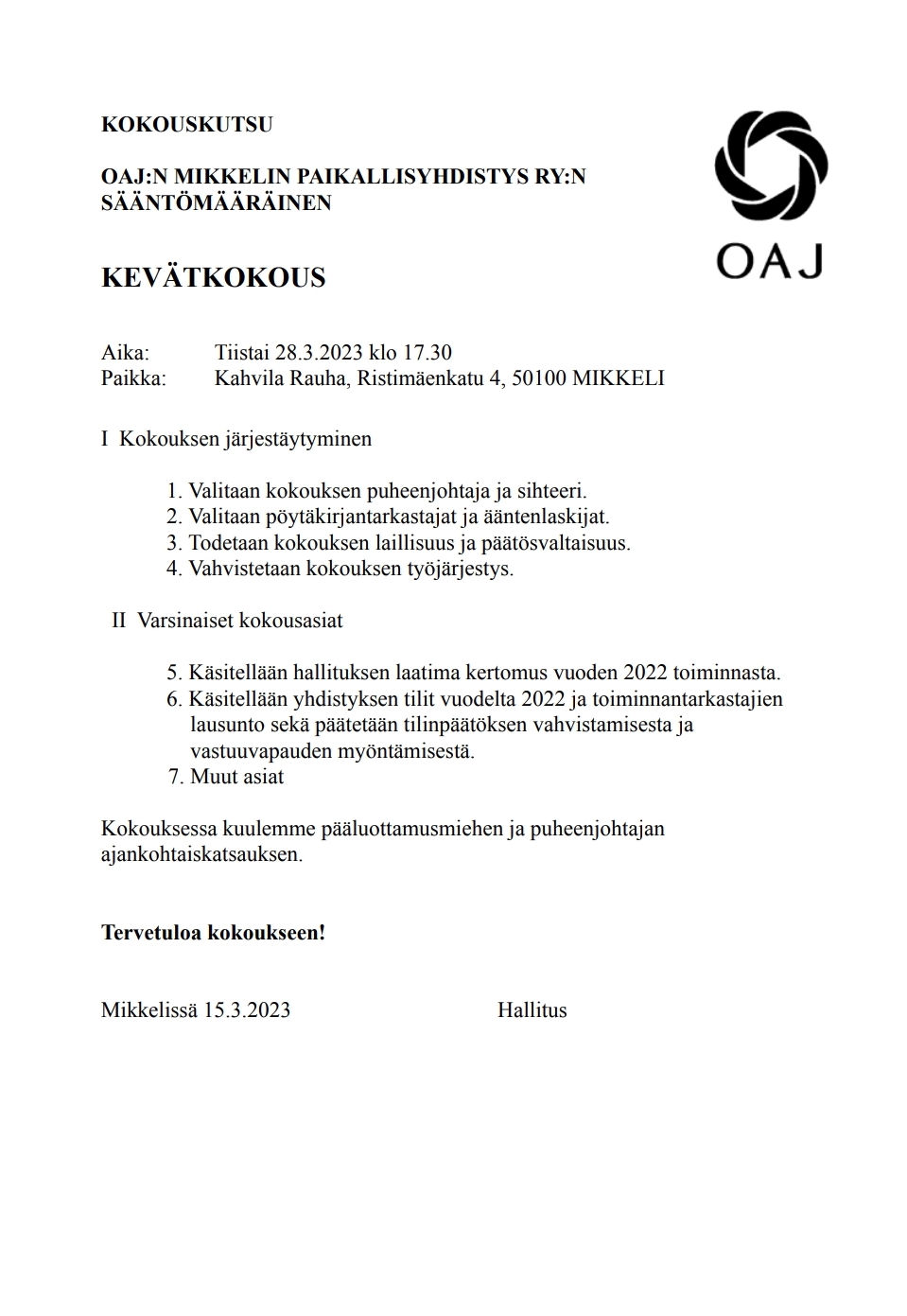 Pyydämme, että ilmoittaudutte kokoukseen tarjoilujen takia viimeistään ma 20.3.2023 mennessä: